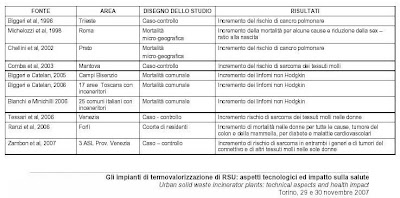 Tabella estrapolata dalla relazione "Effetti sulla salute associati alla residenza in prossimità degli inceneritori" del dr. Pietro Comba e della dr.ssa Lucia Fazzo del Dipartimento Ambiente e Connessa Prevenzione Primaria dell'Istituto Superiore di Sanità, e del dr. Fabrizio Bianchi dell'Istituto di Fisiologia Climatica, Sezione di Epidemiologia del Consiglio Nazionale delle Ricerche di Pisa, presentata al workshop "Gli impianti di termovalorizzazione dei RSU: aspetti tecnologici ed impatto sulla salute" tenutosi a Torino il 29 e 30 novembre 2007 ed organizzato da Arpa Piemonte. La relazione completa si trova sul sito www.arpa.piemonte.itchi vuole vedere l'intervista di Paul Connet clicchi il video: